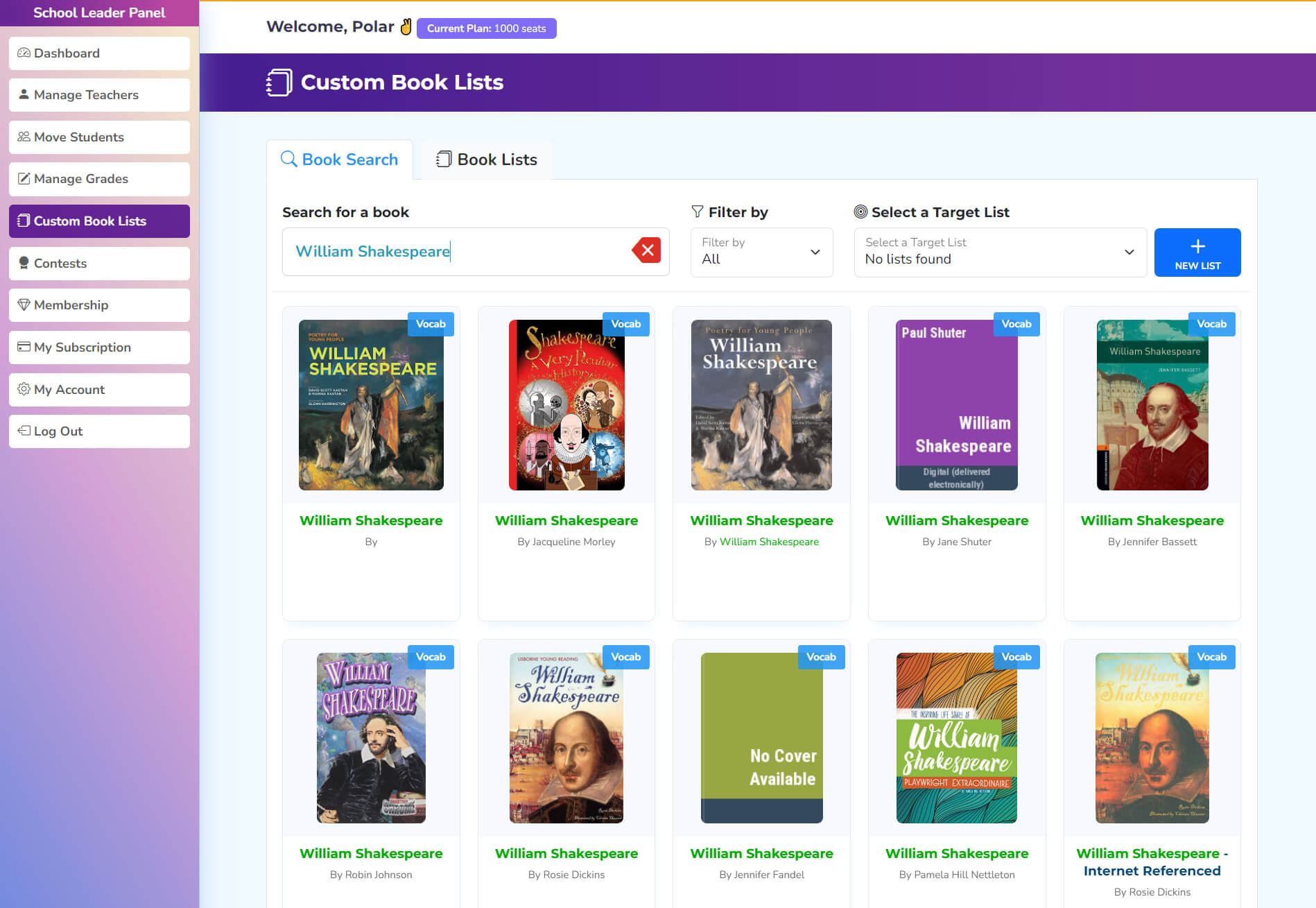 Super users can create various types of book lists that will be accessible to all teachers and their students. This feature allows the creation of lists for multiple teachers simultaneously, catering to the entire school.