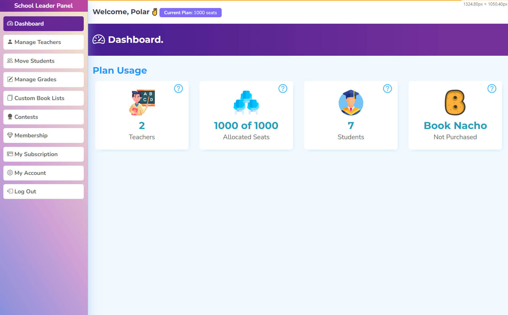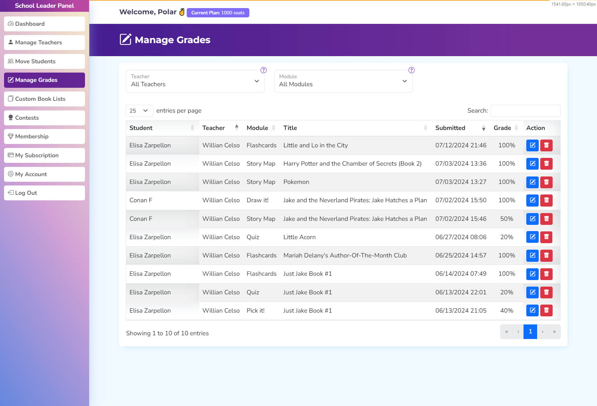 The Super User panel offers tools to manage the entire educational environment. Super users can oversee teachers, move students between classes, manage grades, and create custom book lists.