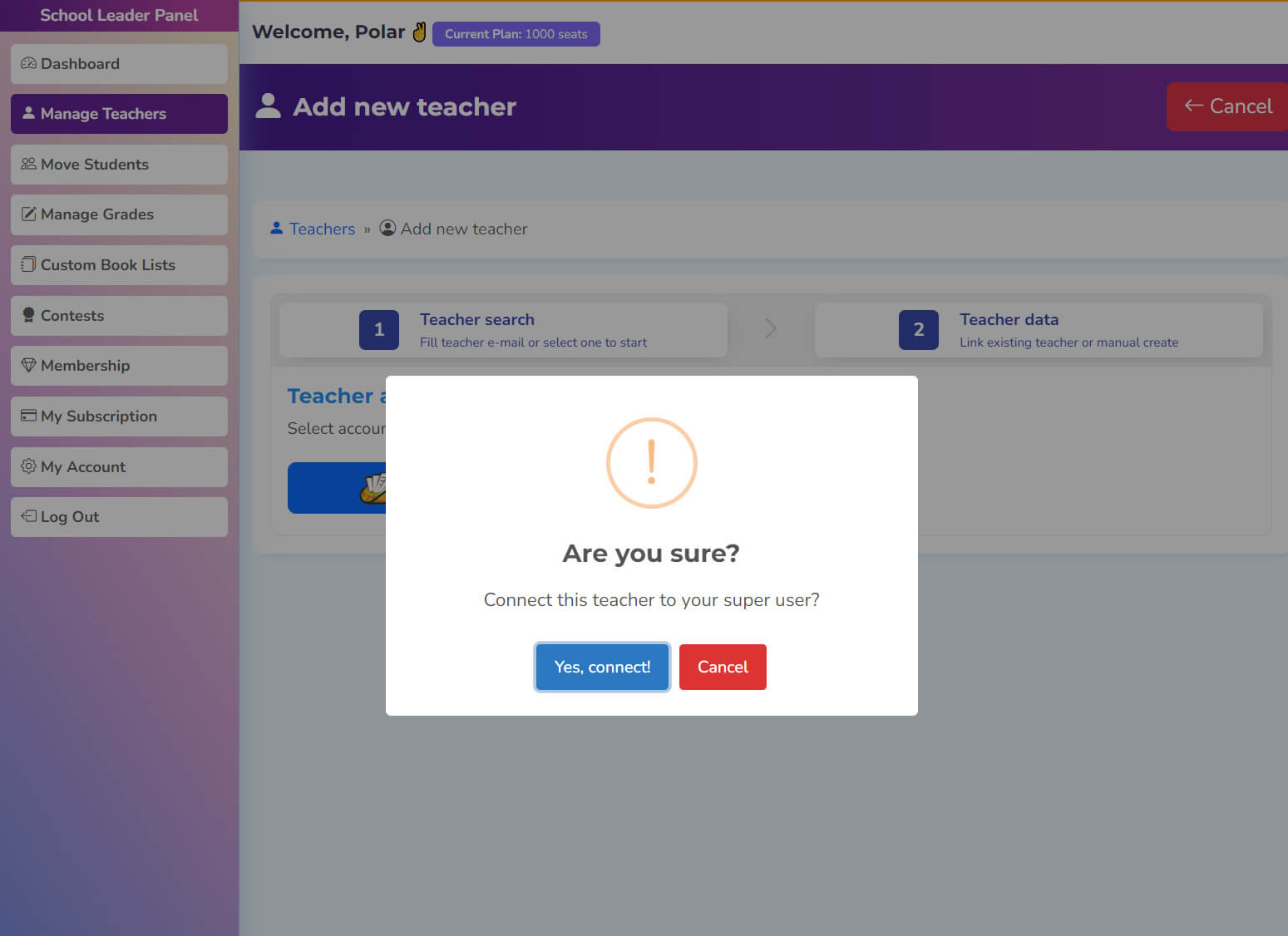 Super users can search for teachers on the platform or invite them to join their team. By inviting a teacher to join, the super user gains supervision over the teacher and their students.
